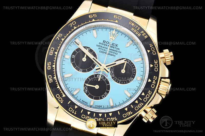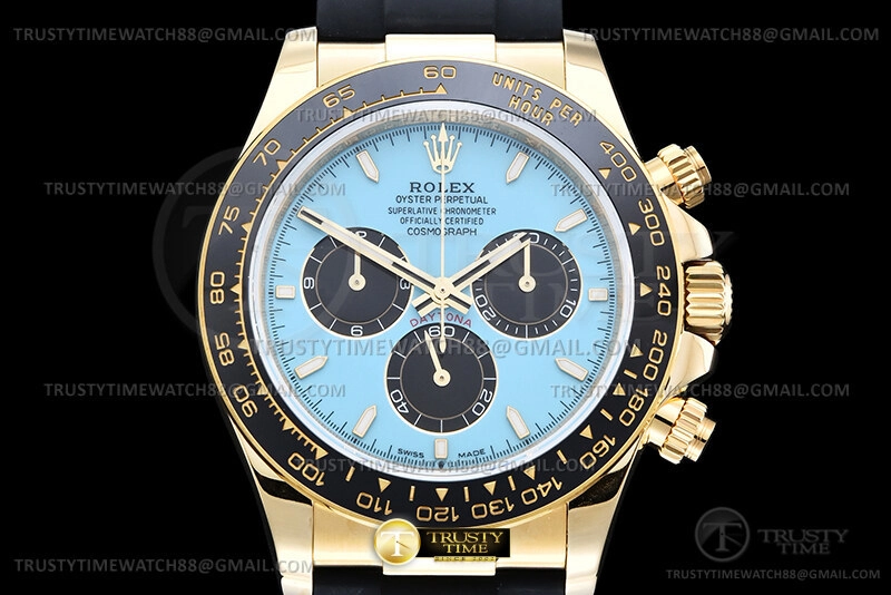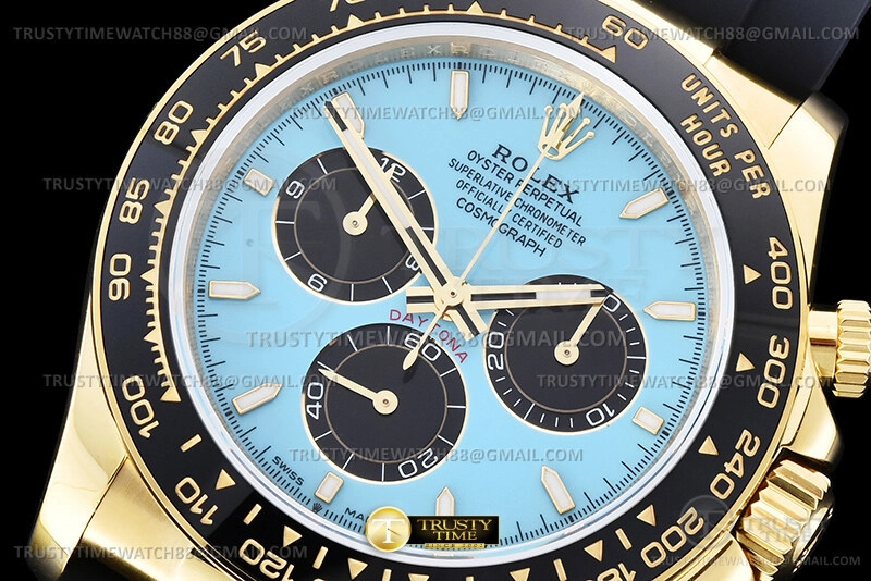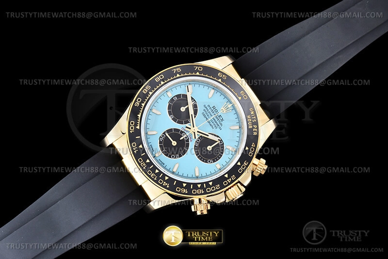 Часы Rolex из коллекции Daytona. Спортивные мужские часы Rolex Cosmograph Daytona 126518LN-0014 премиального качества (Артикул магазина: RX-3533) оснащены надежным автоматическим механизмом с автоподзаводом (работает от амплитуды движения руки) калибра 4131, в котором реализованы следующие функции: часовая, минутная и секундная стрелки, а так же хронограф. Круглый корпус часов цветы желтой золота, имеющий размер 40 мм и высоту 12 мм превосходно дополнит образ и украсит запястье своего обладателя. Для изготовления часов Rolex Cosmograph Daytona 126518LN-0014 предлагаемых в нашем интернет-магазине, применяются нержавеющая сталь 904L высокого качества (Швейцарский стандарт), а так же сапфировое стекло высокой прочности, благодаря чему обеспечивается максимальная защита от сколов и механических повреждений. Отличительной чертой данной модели является голубой циферблат, часовые индексы которого обеспечивают камни. Завершает образ каучуковый ремешок черного цвета с фирменной раскладывающейся застежкой Rolex. Водонепроницаемость данной модели составляет 100М (WR100) – в таких часах можно плавать и нырять без акваланга в морской и пресной воде, а также заниматься водными видами спорта.