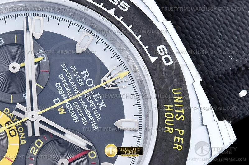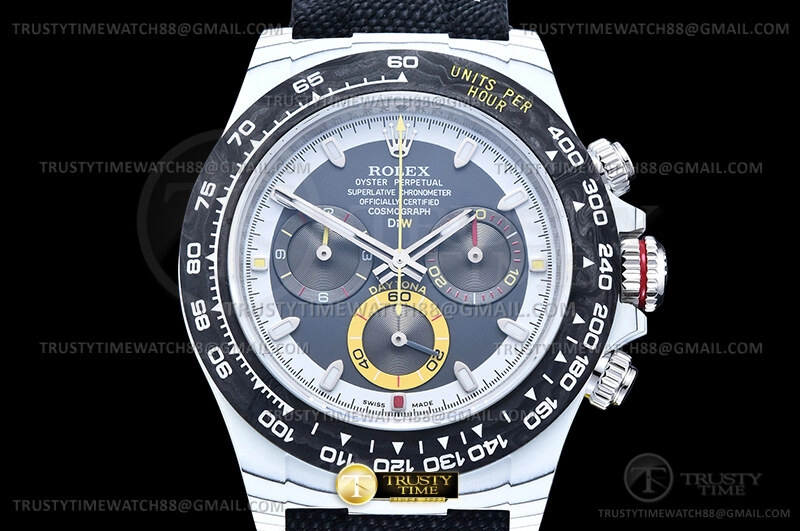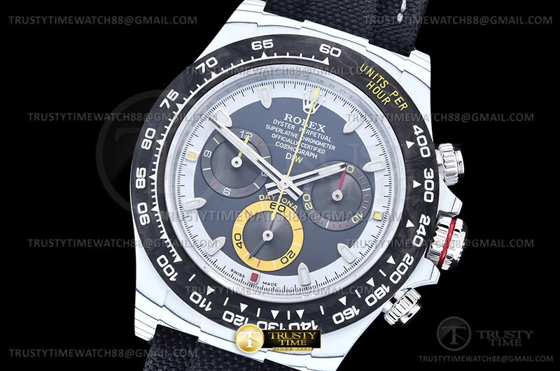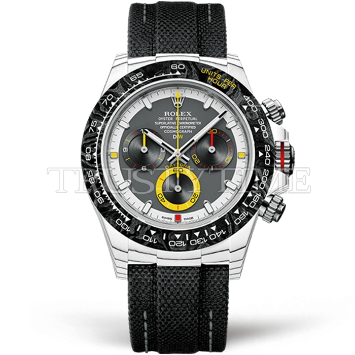 Часы Rolex из коллекции Daytona DIW. Спортивные мужские часы Rolex Cosmograph Daytona DIW Quantum Racer премиального качества (Артикул магазина: RX-3562) оснащены надежным автоматическим механизмом с автоподзаводом (работает от амплитуды движения руки) калибра 4130, в котором реализованы следующие функции: часовая, минутная и секундная стрелки, а так же хронограф. Круглый корпус часов черного цвета, имеющий размер 40 мм и высоту 12.5 мм превосходно дополнит образ и украсит запястье своего обладателя. Для изготовления часов Rolex Cosmograph Daytona DIW Quantum Racer предлагаемых в нашем интернет-магазине, применяются кованый карбон высокого качества (Швейцарский стандарт), а так же сапфировое стекло высокой прочности, благодаря чему обеспечивается максимальная защита от сколов и механических повреждений. Отличительной чертой данной модели является серый циферблат, часовые индексы которого обеспечивают часовые метки. Завершает образ нейлоновый ремешок черного цвета на липучке Rolex. Водонепроницаемость данной модели составляет 30М (WR30) – допускается минимальное воздействие с водой.