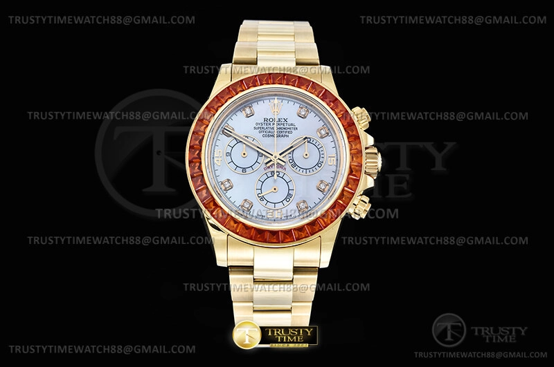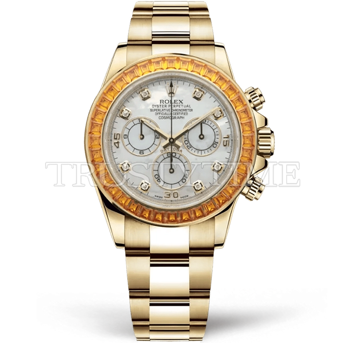 Часы Rolex из коллекции Daytona. Спортивные мужские часы Rolex Cosmograph Daytona Orange Sapphire 116578SACO премиального качества (Артикул магазина: RX-3563) оснащены надежным автоматическим механизмом с автоподзаводом (работает от амплитуды движения руки) калибра 4131, в котором реализованы следующие функции: часовая, минутная и секундная стрелки, а так же хронограф. Круглый корпус часов цветы желтой золота, имеющий размер 40 мм и высоту 12 мм превосходно дополнит образ и украсит запястье своего обладателя. Для изготовления часов Rolex Cosmograph Daytona Orange Sapphire 116578SACO предлагаемых в нашем интернет-магазине, применяются нержавеющая сталь 904L высокого качества (Швейцарский стандарт), а так же сапфировое стекло высокой прочности, благодаря чему обеспечивается максимальная защита от сколов и механических повреждений. Отличительной чертой данной модели является перламутровый циферблат, часовые индексы которого обеспечивают камни. Завершает образ браслет из нержавеющей стали цвета желтого золота с фирменной раскладывающейся застежкой Rolex. Водонепроницаемость данной модели составляет 100М (WR100) – в таких часах можно плавать и нырять без акваланга в морской и пресной воде, а также заниматься водными видами спорта.