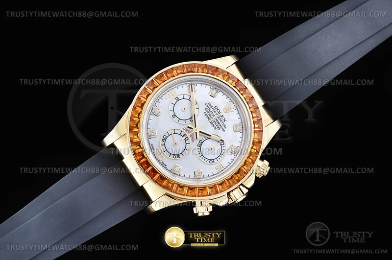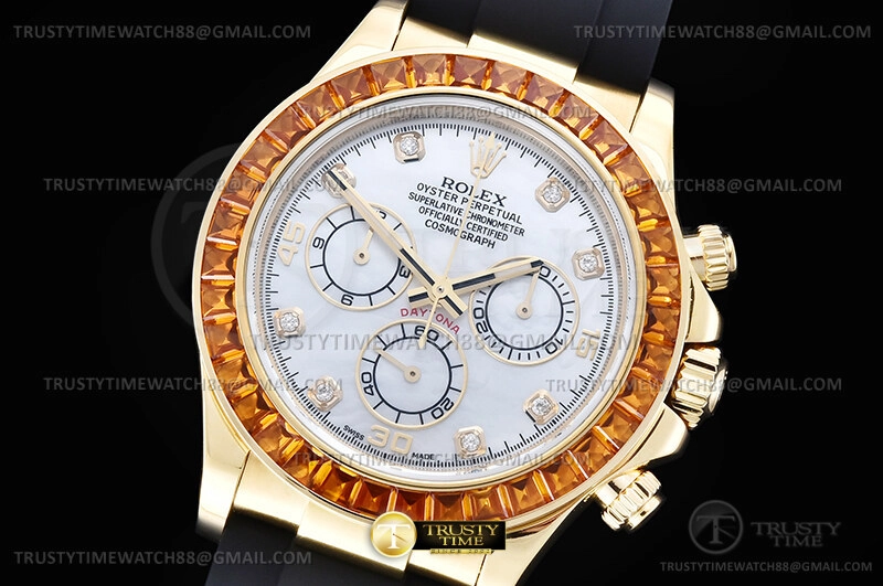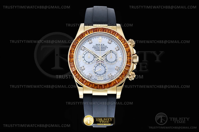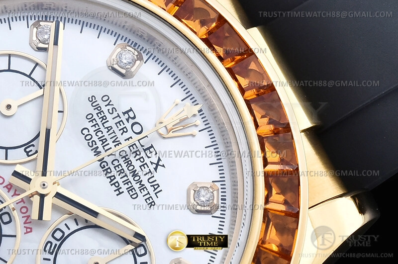 Часы Rolex из коллекции Daytona. Спортивные мужские часы Rolex Cosmograph Daytona Orange Sapphire 116578SACO премиального качества (Артикул магазина: RX-3564) оснащены надежным автоматическим механизмом с автоподзаводом (работает от амплитуды движения руки) калибра 4131, в котором реализованы следующие функции: часовая, минутная и секундная стрелки, а так же хронограф. Круглый корпус часов цветы желтой золота, имеющий размер 40 мм и высоту 12 мм превосходно дополнит образ и украсит запястье своего обладателя. Для изготовления часов Rolex Cosmograph Daytona Orange Sapphire 116578SACO предлагаемых в нашем интернет-магазине, применяются нержавеющая сталь 904L высокого качества (Швейцарский стандарт), а так же сапфировое стекло высокой прочности, благодаря чему обеспечивается максимальная защита от сколов и механических повреждений. Отличительной чертой данной модели является перламутровый циферблат, часовые индексы которого обеспечивают камни. Завершает образ каучуковый ремешок черного цвета с фирменной раскладывающейся застежкой Rolex. Водонепроницаемость данной модели составляет 100М (WR100) – в таких часах можно плавать и нырять без акваланга в морской и пресной воде, а также заниматься водными видами спорта.