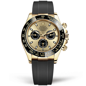 Часы Rolex из коллекции Daytona. Спортивные мужские часы Rolex Cosmograph Daytona 116518LN-0048 премиального качества (Артикул магазина: RX-1209) оснащены надежным автоматическим механизмом с автоподзаводом (работает от амплитуды движения руки) калибра 4130, в котором реализованы следующие функции: часовая, минутная и секундная стрелки, а так же хронограф. Круглый корпус часов цветы желтой золота, имеющий размер 40 мм и высоту 12.5 мм превосходно дополнит образ и украсит запястье своего обладателя. Для изготовления часов Rolex Cosmograph Daytona 116518LN-0048 предлагаемых в нашем интернет-магазине, применяются нержавеющая сталь 316F высокого качества (Швейцарский стандарт), а так же сапфировое стекло высокой прочности, благодаря чему обеспечивается максимальная защита от сколов и механических повреждений. Отличительной чертой данной модели является золотой циферблат, часовые индексы которого обеспечивают часовые метки. Завершает образ каучуковый ремешок черного цвета с фирменной раскладывающейся застежкой Rolex. Водонепроницаемость данной модели составляет 100М (WR100) – в таких часах можно плавать и нырять без акваланга в морской и пресной воде, а также заниматься водными видами спорта.