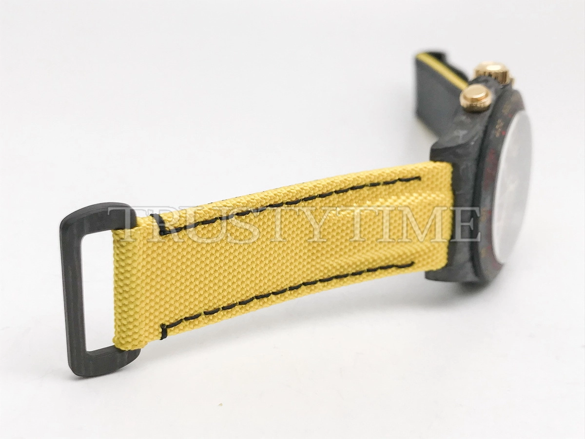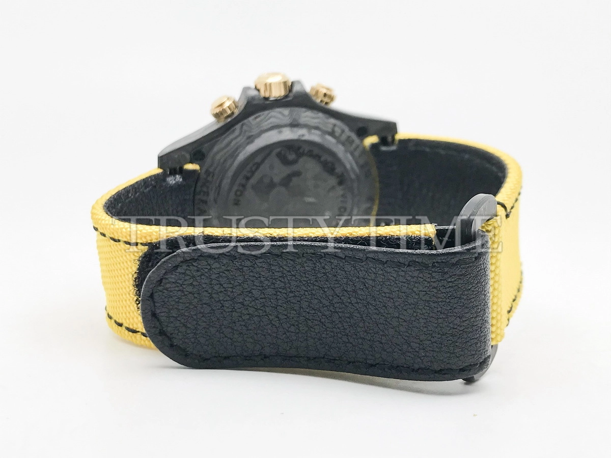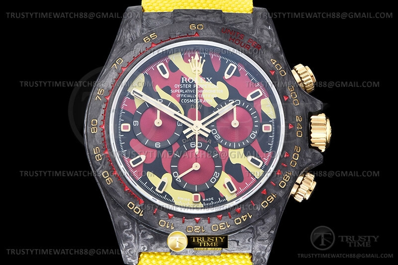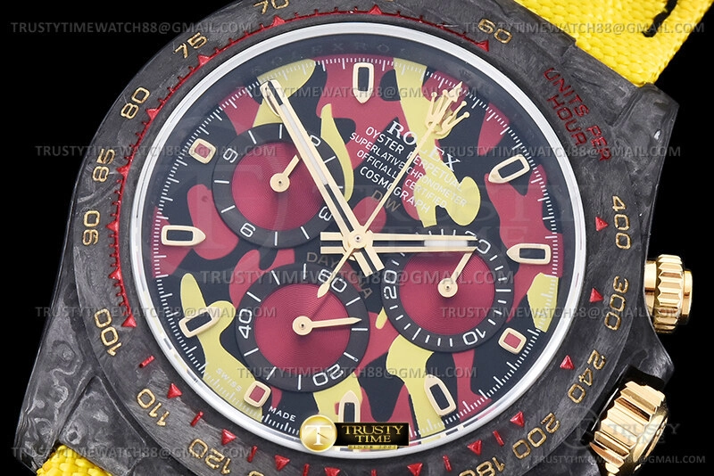 Часы Rolex из коллекции Daytona DIW. Спортивные мужские часы Rolex Cosmograph Daytona DIW Military Yellow премиального качества (Артикул магазина: RX-2295) оснащены надежным автоматическим механизмом с автоподзаводом (работает от амплитуды движения руки) калибра 4130, в котором реализованы следующие функции: часовая, минутная и секундная стрелки, а так же хронограф. Круглый корпус часов черного цвета, имеющий размер 40 мм и высоту 12.5 мм превосходно дополнит образ и украсит запястье своего обладателя. Для изготовления часов Rolex Cosmograph Daytona DIW Military Yellow предлагаемых в нашем интернет-магазине, применяются кованый карбон высокого качества (Швейцарский стандарт), а так же сапфировое стекло высокой прочности, благодаря чему обеспечивается максимальная защита от сколов и механических повреждений. Отличительной чертой данной модели является оранжевый циферблат, часовые индексы которого обеспечивают часовые метки. Завершает образ нейлоновый ремешок желтого цвета на липучке Rolex. Водонепроницаемость данной модели составляет 30М (WR30) – допускается минимальное воздействие с водой.