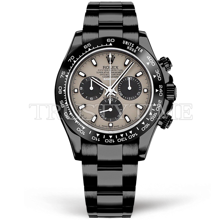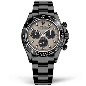 Часы Rolex из коллекции Daytona Blaken. Спортивные мужские часы Rolex Blaken Daytona премиального качества (Артикул магазина: RX-2898) оснащены надежным автоматическим механизмом с автоподзаводом (работает от амплитуды движения руки) калибра 4130, в котором реализованы следующие функции: часовая, минутная и секундная стрелки, а так же хронограф. Круглый корпус часов черного цвета, имеющий размер 40 мм и высоту 12.5 мм превосходно дополнит образ и украсит запястье своего обладателя. Для изготовления часов Rolex Blaken Daytona предлагаемых в нашем интернет-магазине, применяются нержавеющая сталь 904L высокого качества (Швейцарский стандарт), а так же сапфировое стекло высокой прочности, благодаря чему обеспечивается максимальная защита от сколов и механических повреждений. Отличительной чертой данной модели является серый циферблат, без меток и цифр. Завершает образ браслет из нержавеющей стали черного цвета с фирменной раскладывающейся застежкой Rolex. Водонепроницаемость данной модели составляет 30М (WR30) – допускается минимальное воздействие с водой.