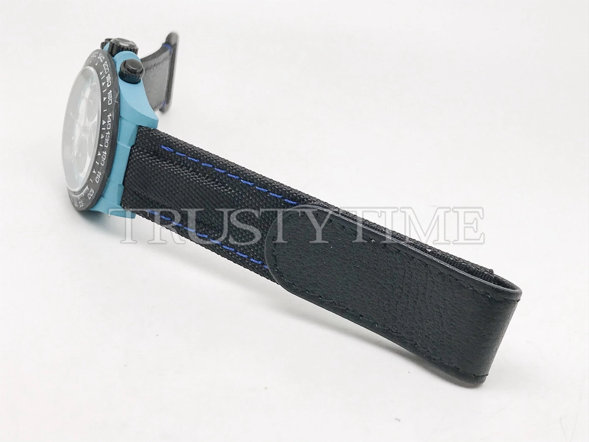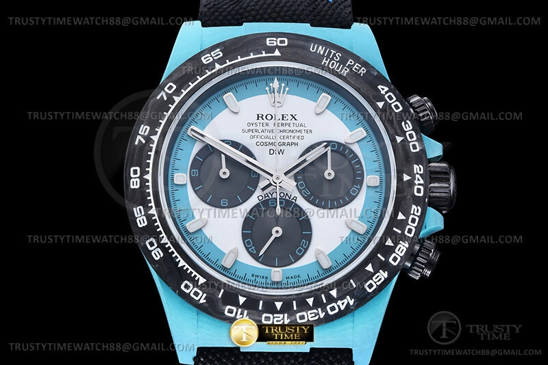 Часы Rolex из коллекции Daytona DIW. Спортивные мужские часы Rolex Cosmograph Daytona DIW Celeste Invert премиального качества (Артикул магазина: RX-3423) оснащены надежным автоматическим механизмом с автоподзаводом (работает от амплитуды движения руки) калибра 4130, в котором реализованы следующие функции: часовая, минутная и секундная стрелки, а так же хронограф. Круглый корпус часов голубого цвета, имеющий размер 40 мм и высоту 12.5 мм превосходно дополнит образ и украсит запястье своего обладателя. Для изготовления часов Rolex Cosmograph Daytona DIW Celeste Invert предлагаемых в нашем интернет-магазине, применяются кованый карбон высокого качества (Швейцарский стандарт), а так же сапфировое стекло высокой прочности, благодаря чему обеспечивается максимальная защита от сколов и механических повреждений. Отличительной чертой данной модели является белый циферблат, часовые индексы которого обеспечивают часовые метки. Завершает образ нейлоновый ремешок черного цвета на липучке Rolex. Водонепроницаемость данной модели составляет 30М (WR30) – допускается минимальное воздействие с водой.