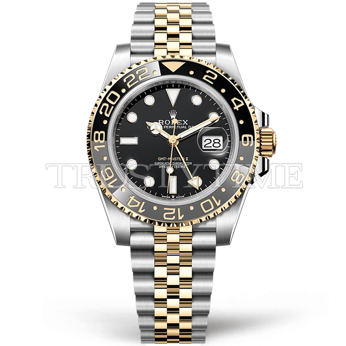 Часы Rolex из коллекции GMT Master II. Классические мужские часы Rolex GMT Master II 40mm 126713GRNR-0001 премиального качества (Артикул магазина: RX-2882) оснащены надежным автоматическим механизмом с автоподзаводом (работает от амплитуды движения руки) калибра 3285, в котором реализованы следующие функции: часовая, минутная и секундная стрелки, а так же дата, двойное время (GMT). Круглый корпус часов комбинированного сталь с желтого золота цвета, имеющий размер 40 мм и высоту 12 мм превосходно дополнит образ и украсит запястье своего обладателя. Для изготовления часов Rolex GMT Master II 40mm 126713GRNR-0001 предлагаемых в нашем интернет-магазине, применяются нержавеющая сталь 904L высокого качества (Швейцарский стандарт), а так же сапфировое стекло высокой прочности, благодаря чему обеспечивается максимальная защита от сколов и механических повреждений. Отличительной чертой данной модели является черный циферблат, часовые индексы которого обеспечивают часовые метки. Завершает образ браслет из нержавеющей стали комбинированного сталь с желтым золотом цвета с фирменной раскладывающейся застежкой Rolex. Водонепроницаемость данной модели составляет 30М (WR30) – допускается минимальное воздействие с водой.