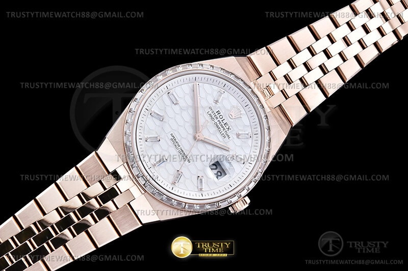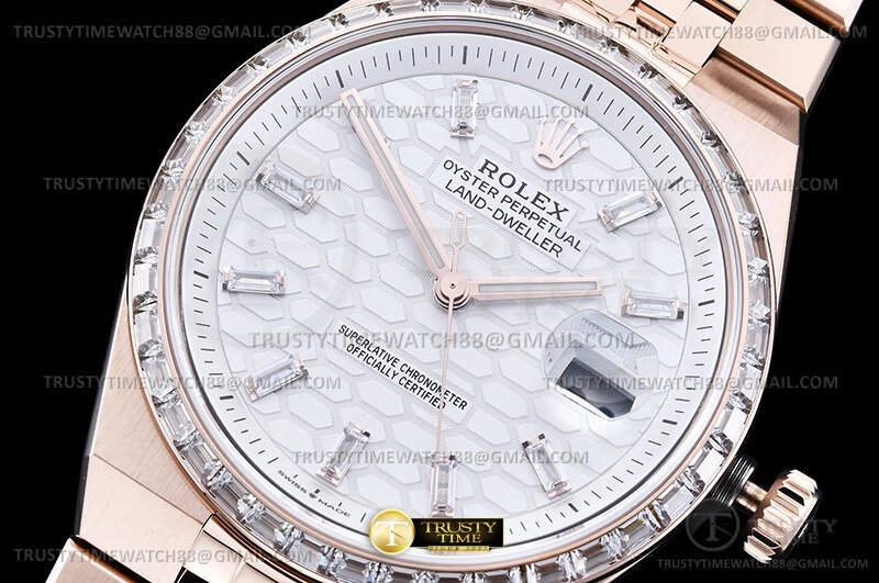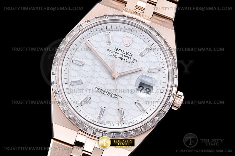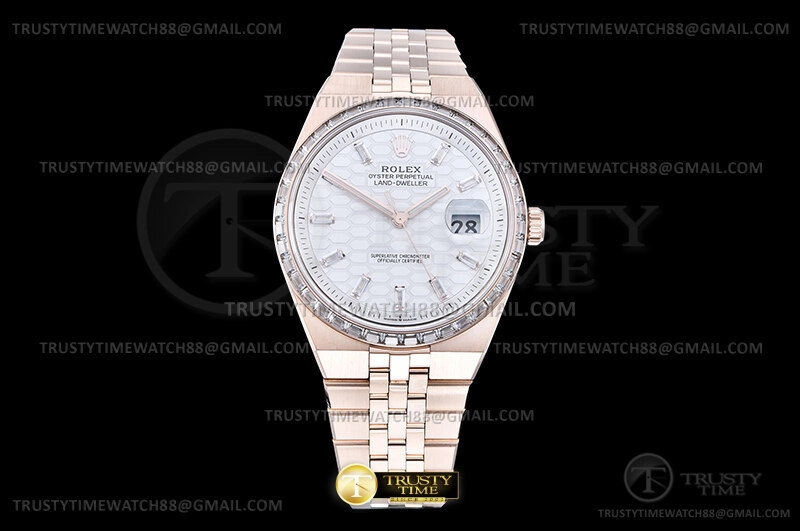Часы Rolex из коллекции Land-Dweller. Классические мужские часы Rolex Land-Dweller 40mm 127385TBR-0003 премиального качества (Артикул магазина: RX-3542) оснащены надежным автоматическим механизмом с автоподзаводом (работает от амплитуды движения руки) калибра 7135, в котором реализованы следующие функции: часовая, минутная и секундная стрелки, а так же дата. Круглый корпус часов розового цвета, имеющий размер 40 мм и высоту 11 мм превосходно дополнит образ и украсит запястье своего обладателя. Для изготовления часов Rolex Land-Dweller 40mm 127385TBR-0003 предлагаемых в нашем интернет-магазине, применяются нержавеющая сталь 316F высокого качества (Швейцарский стандарт), а так же сапфировое стекло высокой прочности, благодаря чему обеспечивается максимальная защита от сколов и механических повреждений. Отличительной чертой данной модели является белый циферблат, часовые индексы которого обеспечивают камни. Завершает образ браслет из нержавеющей стали цвета розового золота с фирменной раскладывающейся застежкой Rolex. Водонепроницаемость данной модели составляет 30М (WR30) – допускается минимальное воздействие с водой.
