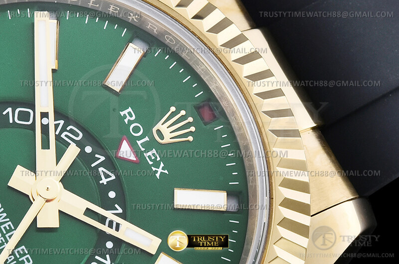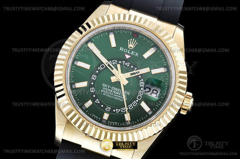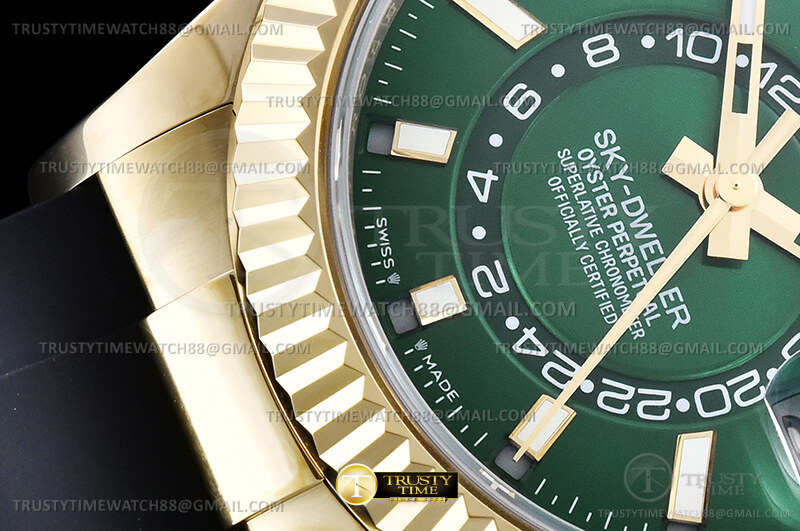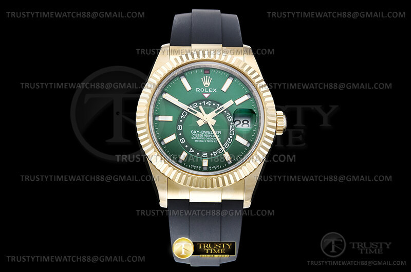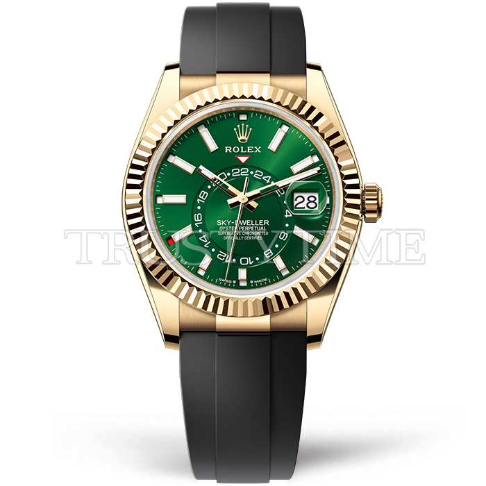 Часы Rolex из коллекции Sky Dweller. Классические мужские часы Rolex Sky-Dweller 42mm 336238-0004 премиального качества (Артикул магазина: RX-3521) оснащены надежным автоматическим механизмом с автоподзаводом (работает от амплитуды движения руки) калибра 9001, в котором реализованы следующие функции: часовая, минутная и секундная стрелки, а так же дата, двойное время (GMT), месяц. Круглый корпус часов цветы желтой золота, имеющий размер 42 мм и высоту 15 мм превосходно дополнит образ и украсит запястье своего обладателя. Для изготовления часов Rolex Sky-Dweller 42mm 336238-0004 предлагаемых в нашем интернет-магазине, применяются нержавеющая сталь 904L высокого качества (Швейцарский стандарт), а так же сапфировое стекло высокой прочности, благодаря чему обеспечивается максимальная защита от сколов и механических повреждений. Отличительной чертой данной модели является зеленый циферблат, часовые индексы которого обеспечивают часовые метки. Завершает образ каучуковый ремешок черного цвета с фирменной раскладывающейся застежкой Rolex. Водонепроницаемость данной модели составляет 30М (WR30) – допускается минимальное воздействие с водой.