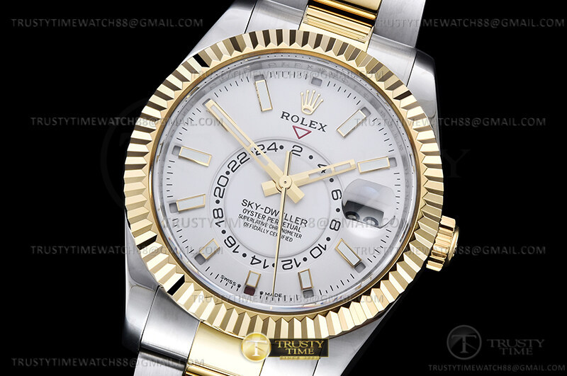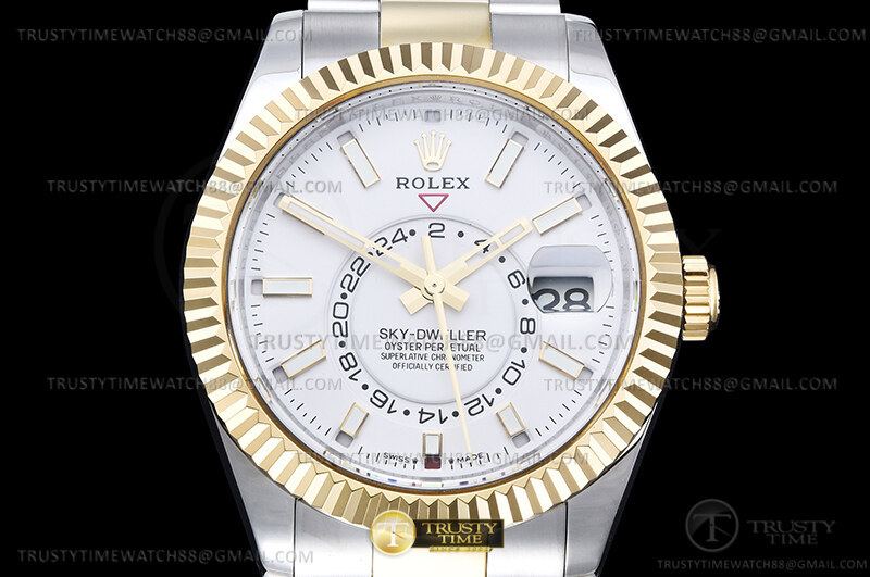 Часы Rolex из коллекции Sky-Dweller. Классические мужские часы Rolex Sky-Dweller 42mm 326933-0005 премиального качества (Артикул магазина: RX-2828) оснащены надежным автоматическим механизмом с автоподзаводом (работает от амплитуды движения руки) калибра 9002, в котором реализованы следующие функции: часовая, минутная и секундная стрелки, а так же дата, двойное время (GMT), месяц. Круглый корпус часов комбинированного сталь с желтого золота цвета, имеющий размер 42 мм и высоту 15 мм превосходно дополнит образ и украсит запястье своего обладателя. Для изготовления часов Rolex Sky-Dweller 42mm 326933-0005 предлагаемых в нашем интернет-магазине, применяются нержавеющая сталь 316F высокого качества (Швейцарский стандарт), а так же сапфировое стекло высокой прочности, благодаря чему обеспечивается максимальная защита от сколов и механических повреждений. Отличительной чертой данной модели является белый циферблат, часовые индексы которого обеспечивают часовые метки. Завершает образ браслет из нержавеющей стали комбинированного сталь с желтым золотом цвета с фирменной раскладывающейся застежкой Rolex. Водонепроницаемость данной модели составляет 30М (WR30) – допускается минимальное воздействие с водой.