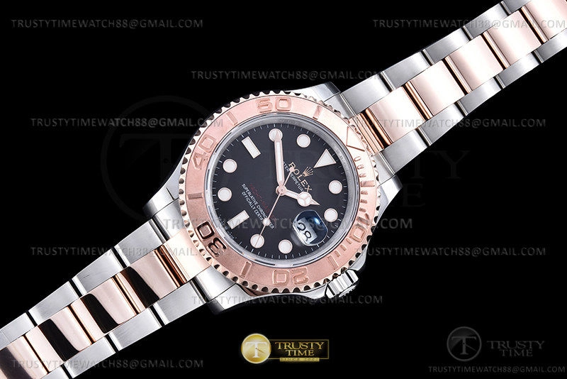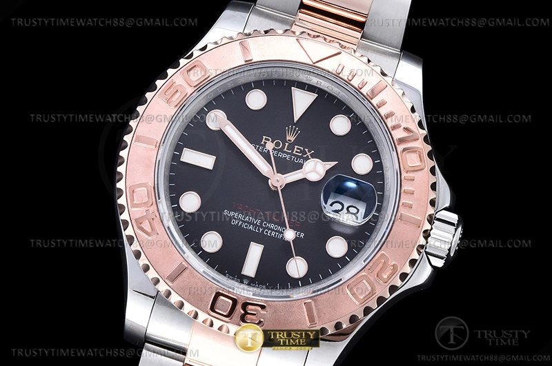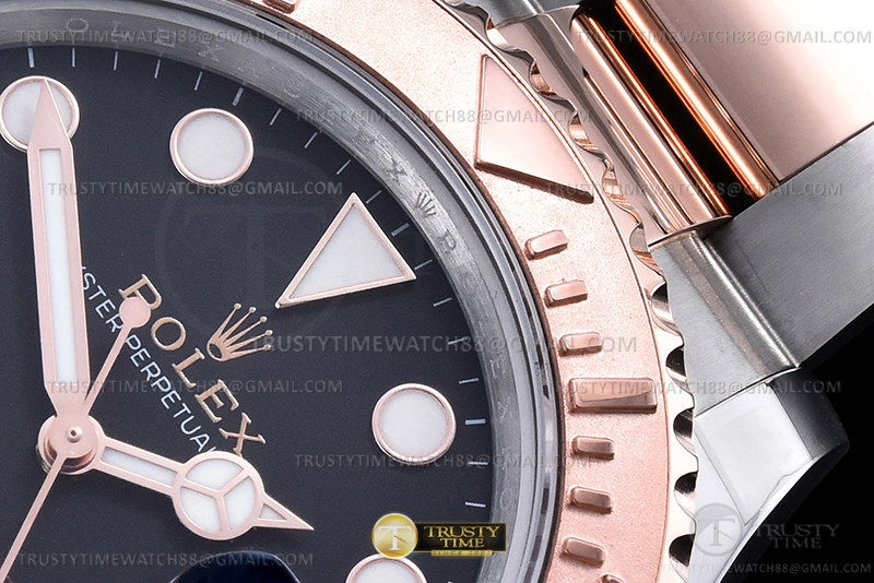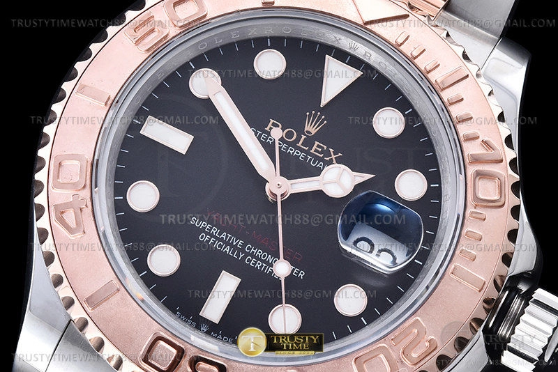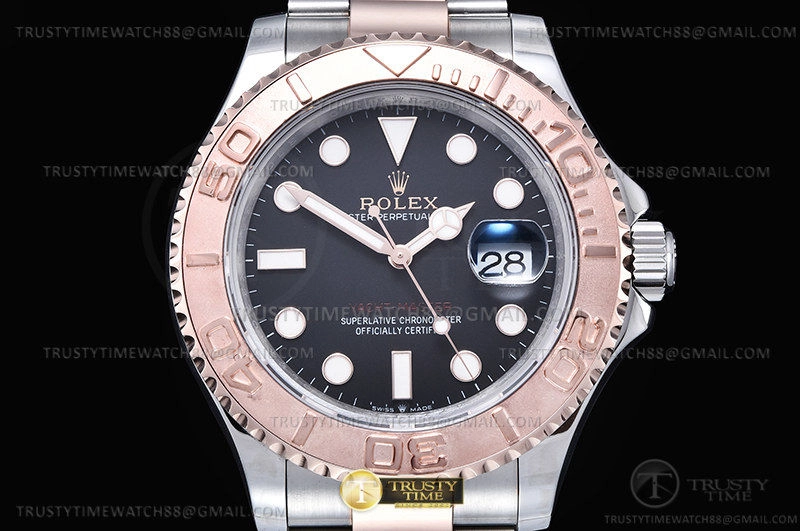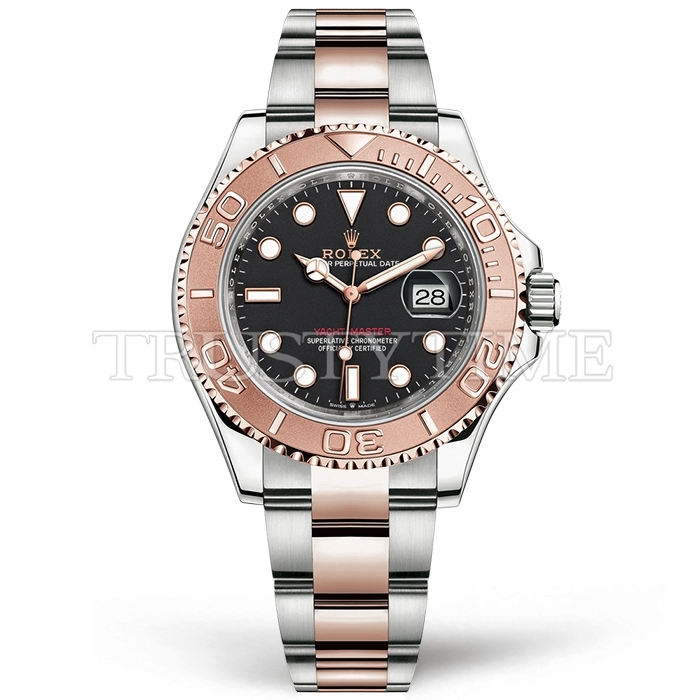 Часы Rolex из коллекции Yacht-Master. Классические мужские часы Rolex Yacht-Master 40mm 126621-0002 премиального качества (Артикул магазина: RX-2902) оснащены надежным автоматическим механизмом с автоподзаводом (работает от амплитуды движения руки) калибра 3135, в котором реализованы следующие функции: часовая, минутная и секундная стрелки, а так же дата. Круглый корпус часов комбинированного сталь с розового золота цвета, имеющий размер 40 мм и высоту 12 мм превосходно дополнит образ и украсит запястье своего обладателя. Для изготовления часов Rolex Yacht-Master 40mm 126621-0002 предлагаемых в нашем интернет-магазине, применяются нержавеющая сталь 316F высокого качества (Швейцарский стандарт), а так же сапфировое стекло высокой прочности, благодаря чему обеспечивается максимальная защита от сколов и механических повреждений. Отличительной чертой данной модели является черный циферблат, часовые индексы которого обеспечивают часовые метки. Завершает образ браслет из нержавеющей стали комбинированного сталь с розовым золотом цвета с фирменной раскладывающейся застежкой Rolex. Водонепроницаемость данной модели составляет 30М (WR30) – допускается минимальное воздействие с водой.