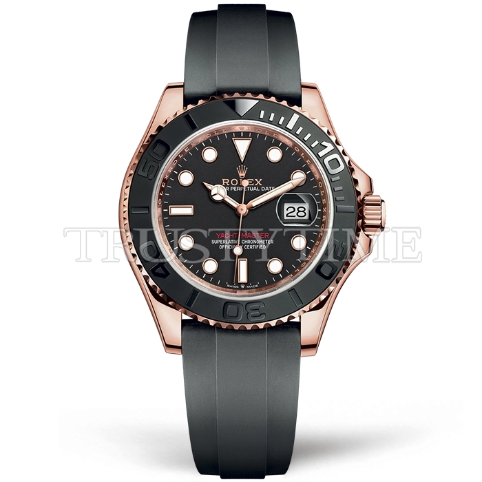 Часы Rolex из коллекции Yacht-Master. Классические мужские часы Rolex Yacht-Master 40mm 126655-0002 премиального качества (Артикул магазина: RX-3488) оснащены надежным автоматическим механизмом с автоподзаводом (работает от амплитуды движения руки) калибра 3235, в котором реализованы следующие функции: часовая, минутная и секундная стрелки, а так же дата. Круглый корпус часов розового цвета, имеющий размер 40 мм и высоту 12.5 мм превосходно дополнит образ и украсит запястье своего обладателя. Для изготовления часов Rolex Yacht-Master 40mm 126655-0002 предлагаемых в нашем интернет-магазине, применяются нержавеющая сталь 316F высокого качества (Швейцарский стандарт), а так же сапфировое стекло высокой прочности, благодаря чему обеспечивается максимальная защита от сколов и механических повреждений. Отличительной чертой данной модели является черный циферблат, часовые индексы которого обеспечивают часовые метки. Завершает образ каучуковый ремешок черного цвета с фирменной раскладывающейся застежкой Rolex. Водонепроницаемость данной модели составляет 30М (WR30) – допускается минимальное воздействие с водой.