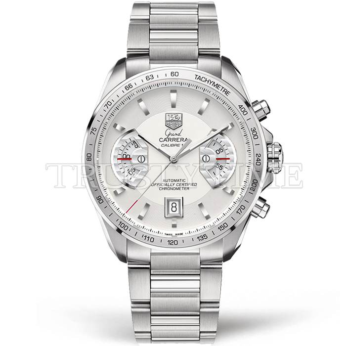 Часы Tag Heuer из коллекции Grand Carrera. Спортивные мужские часы Tag Heuer Grand Carrera Calibre 17 RS 43mm CAV511B.BA0902 премиального качества (Артикул магазина: TG-0310) оснащены надежным автоматическим механизмом с автоподзаводом (работает от амплитуды движения руки) калибра Valjoux-7750, в котором реализованы следующие функции: часовая, минутная и секундная стрелки, а так же хронограф, дата. Круглый корпус часов стального цвета, имеющий размер 43 мм и высоту 14.8 мм превосходно дополнит образ и украсит запястье своего обладателя. Для изготовления часов Tag Heuer Grand Carrera Calibre 17 RS 43mm CAV511B.BA0902 предлагаемых в нашем интернет-магазине, применяются нержавеющая сталь 316L высокого качества (Швейцарский стандарт), а так же сапфировое стекло высокой прочности, благодаря чему обеспечивается максимальная защита от сколов и механических повреждений. Отличительной чертой данной модели является белый циферблат, часовые индексы которого обеспечивают часовые метки. Завершает образ браслет из нержавеющей стали стального цвета с фирменной раскладывающейся застежкой Tag Heuer. Водонепроницаемость данной модели составляет 30М (WR30) – допускается минимальное воздействие с водой.