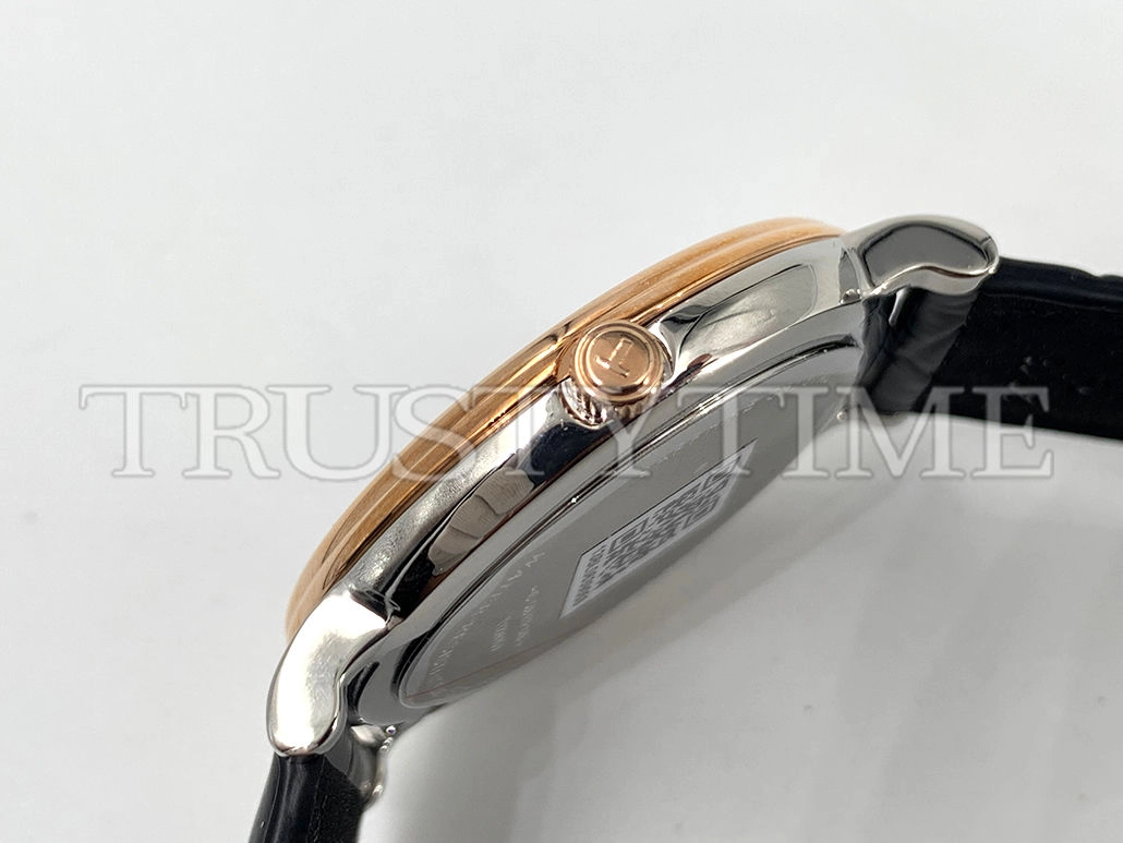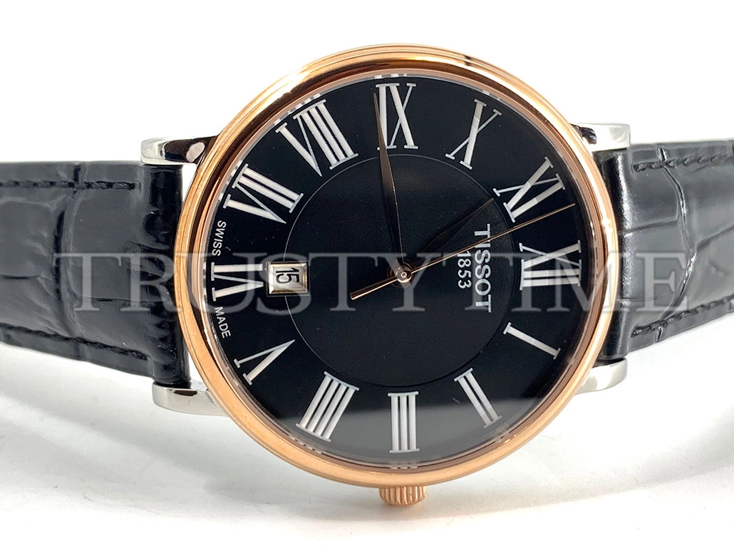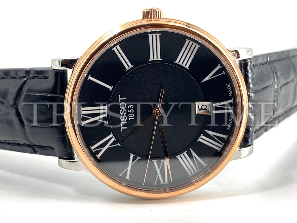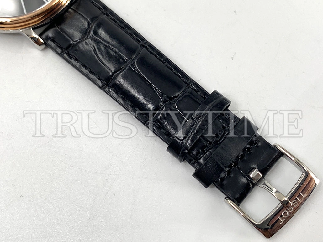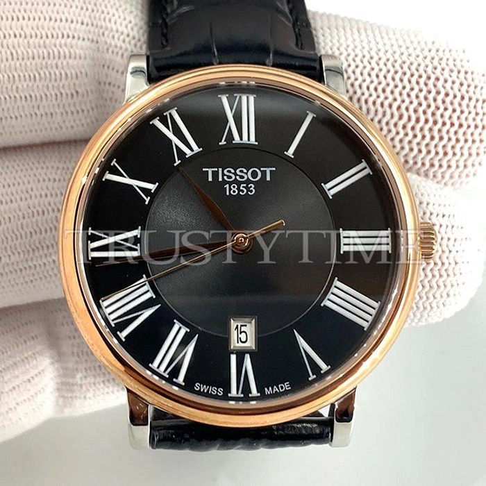 Часы Tissot из коллекции Carson Premium. Классические мужские часы Tissot Carson Premium Quartz 40 качества ААА+ (Артикул магазина: TT-0309) оснащены надежным кварцевым механизмом (работает от батареи) калибра Quartz ETA 251.471, в котором реализованы следующие функции: часовая, минутная и секундная стрелки, а так же дата. Круглый корпус часов комбинированного сталь с розового золота цвета, имеющий размер 40 мм и высоту 8 мм превосходно дополнит образ и украсит запястье своего обладателя. Для изготовления часов Tissot Carson Premium Quartz 40 предлагаемых в нашем интернет-магазине, применяются нержавеющая сталь 316L высокого качества (Швейцарский стандарт), а так же сапфировое стекло высокой прочности, благодаря чему обеспечивается максимальная защита от сколов и механических повреждений. Отличительной чертой данной модели является черный циферблат, часовые индексы которого обеспечивают римские цифры. Завершает образ кожаный ремешок черного цвета с фирменной классической застежкой Tissot. Водонепроницаемость данной модели составляет 30М (WR30) – допускается минимальное воздействие с водой.