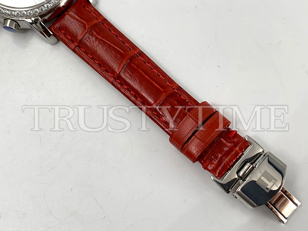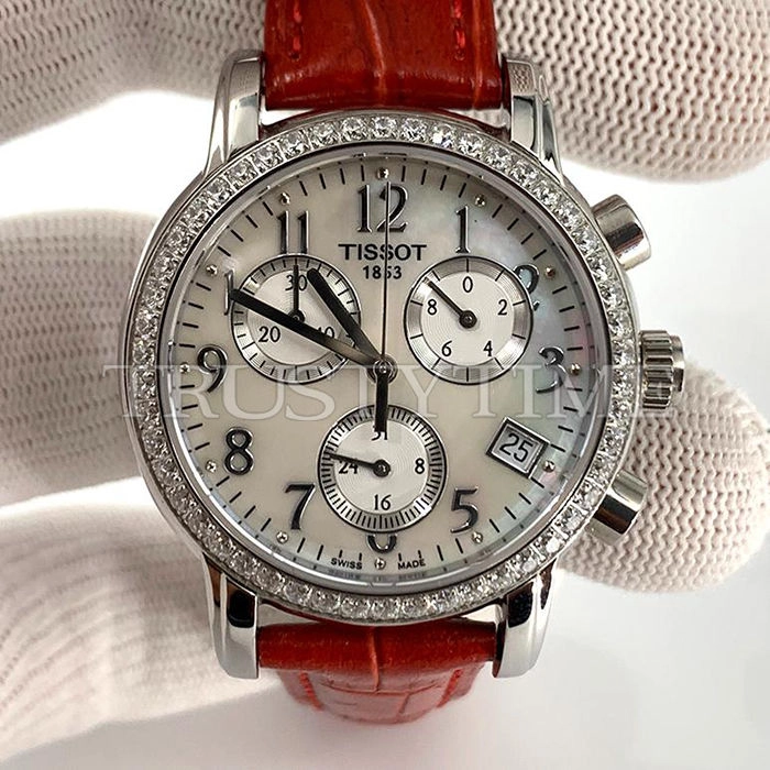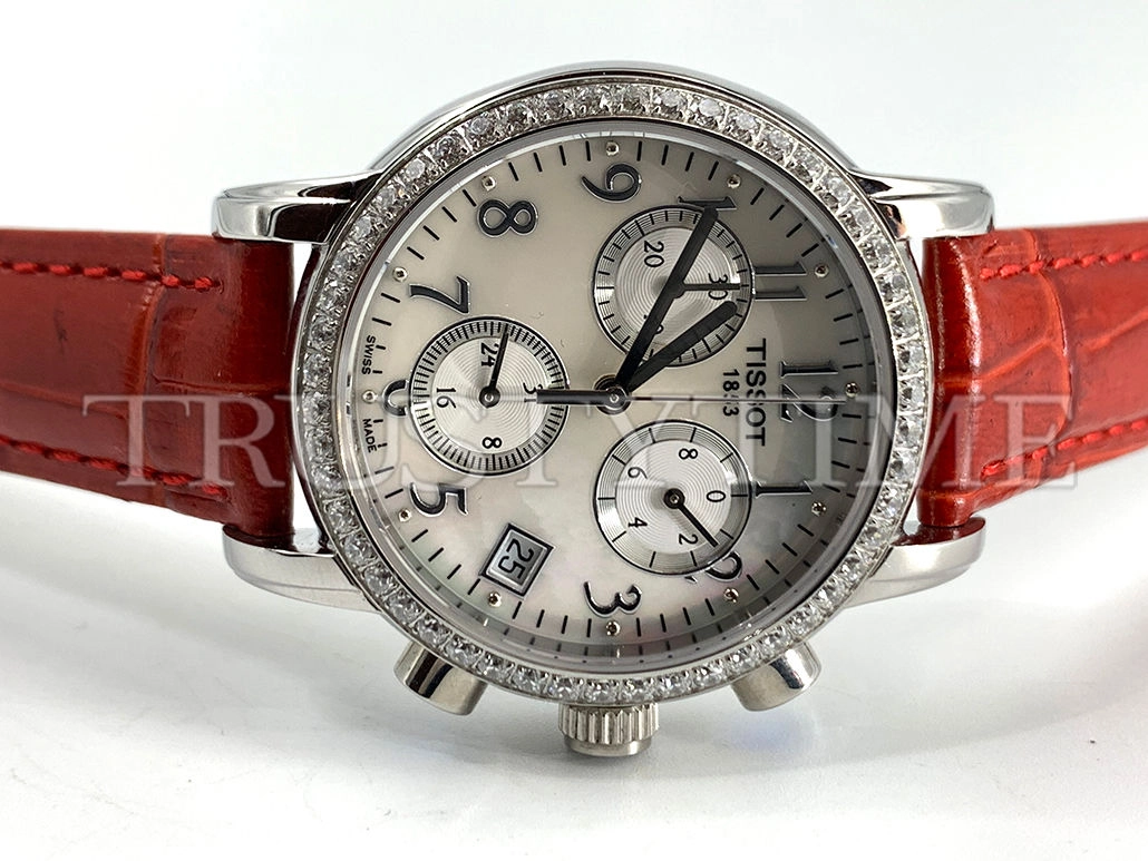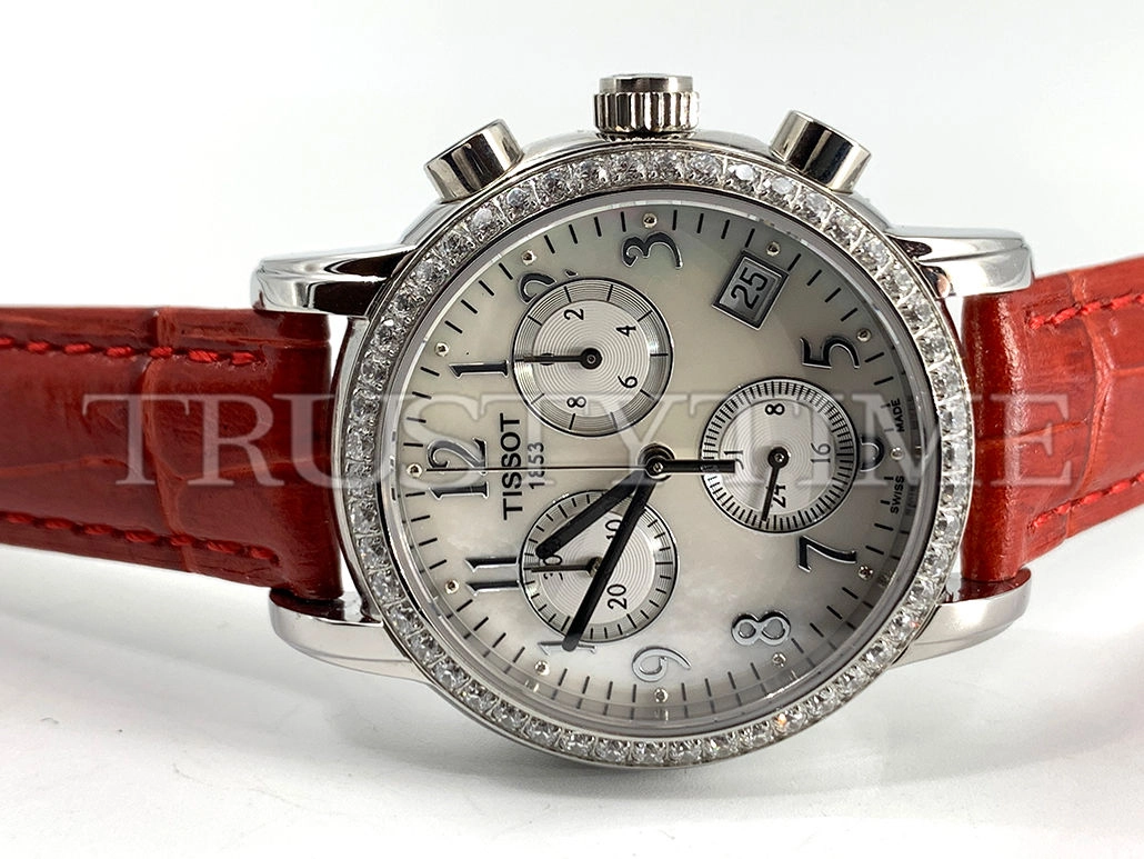 Часы Tissot из коллекции Carson Chronograph. Спортивные женские часы Tissot Carson Chronograph Quartz 33 качества ААА+ (Артикул магазина: TT-0369) оснащены надежным кварцевым механизмом (работает от батареи) калибра Quartz ETA 256.031, в котором реализованы следующие функции: часовая, минутная и секундная стрелки, а так же хронограф, дата. Круглый корпус часов стального цвета, имеющий размер 33 мм и высоту 10 мм превосходно дополнит образ и украсит запястье своего обладателя. Для изготовления часов Tissot Carson Chronograph Quartz 33 предлагаемых в нашем интернет-магазине, применяются нержавеющая сталь 316L высокого качества (Швейцарский стандарт), а так же сапфировое стекло высокой прочности, благодаря чему обеспечивается максимальная защита от сколов и механических повреждений. Отличительной чертой данной модели является перламутровый циферблат, часовые индексы которого обеспечивают арабские цифры. Завершает образ кожаный ремешок красного цвета с фирменной раскладывающейся застежкой Tissot. Водонепроницаемость данной модели составляет 30М (WR30) – допускается минимальное воздействие с водой.