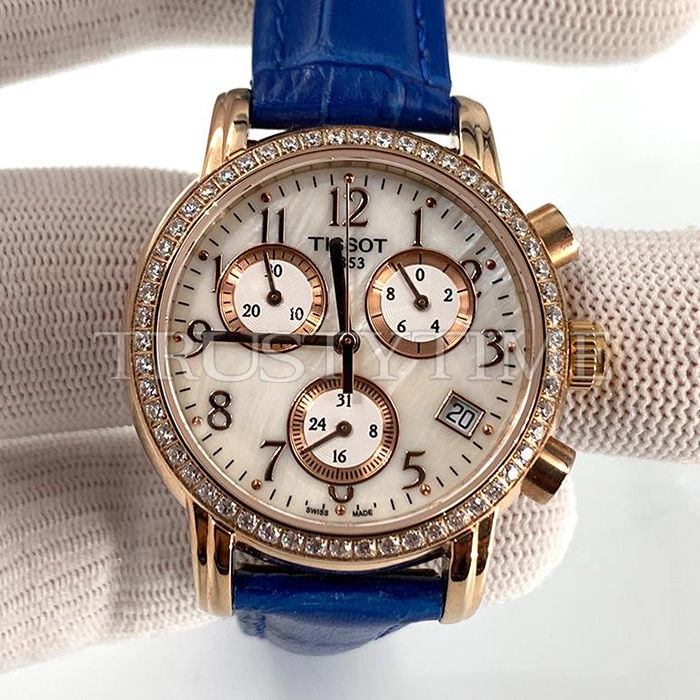 Часы Tissot из коллекции Carson Chronograph. Спортивные женские часы Tissot Carson Chronograph Quartz 33 качества ААА+ (Артикул магазина: TT-0370) оснащены надежным кварцевым механизмом (работает от батареи) калибра Quartz ETA 256.031, в котором реализованы следующие функции: часовая, минутная и секундная стрелки, а так же хронограф, дата. Круглый корпус часов розового цвета, имеющий размер 33 мм и высоту 10 мм превосходно дополнит образ и украсит запястье своего обладателя. Для изготовления часов Tissot Carson Chronograph Quartz 33 предлагаемых в нашем интернет-магазине, применяются нержавеющая сталь 316L высокого качества (Швейцарский стандарт), а так же сапфировое стекло высокой прочности, благодаря чему обеспечивается максимальная защита от сколов и механических повреждений. Отличительной чертой данной модели является перламутровый циферблат, часовые индексы которого обеспечивают арабские цифры. Завершает образ кожаный ремешок синего цвета с фирменной раскладывающейся застежкой Tissot. Водонепроницаемость данной модели составляет 30М (WR30) – допускается минимальное воздействие с водой.