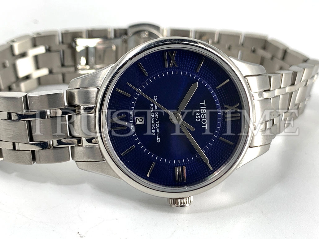 Часы Tissot из коллекции Chemin Des Tourelles. Классические женские часы Tissot Chemin Des Tourelles Powermatic 80 32 качества ААА+ (Артикул магазина: TT-0384) оснащены надежным кварцевым механизмом (работает от батареи) калибра Quartz ETA 251.471, в котором реализованы следующие функции: часовая, минутная и секундная стрелки, а так же дата. Круглый корпус часов стального цвета, имеющий размер 32 мм и высоту 7 мм превосходно дополнит образ и украсит запястье своего обладателя. Для изготовления часов Tissot Chemin Des Tourelles Powermatic 80 32 предлагаемых в нашем интернет-магазине, применяются нержавеющая сталь 316L высокого качества (Швейцарский стандарт), а так же сапфировое стекло высокой прочности, благодаря чему обеспечивается максимальная защита от сколов и механических повреждений. Отличительной чертой данной модели является синий циферблат, часовые индексы которого обеспечивают римские цифры. Завершает образ браслет из нержавеющей стали стального цвета с фирменной раскладывающейся застежкой Tissot. Водонепроницаемость данной модели составляет 30М (WR30) – допускается минимальное воздействие с водой.
