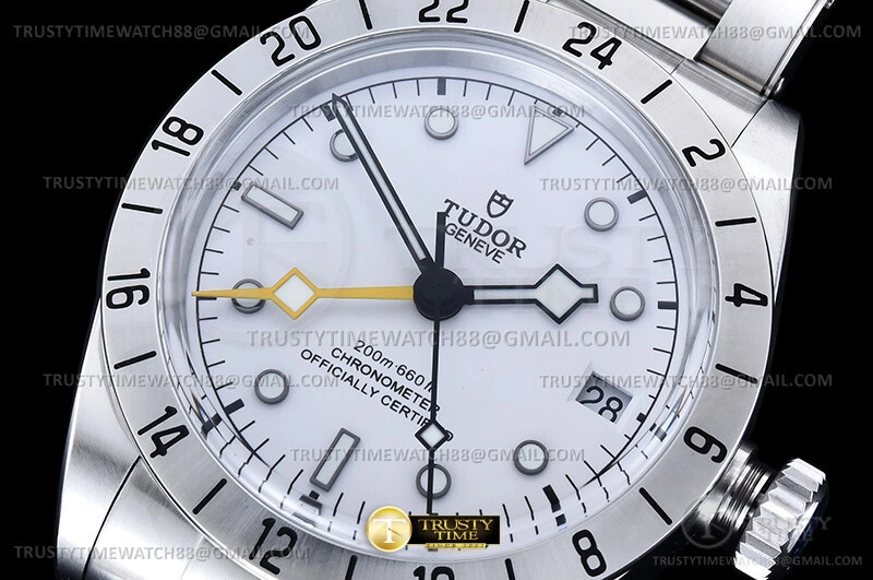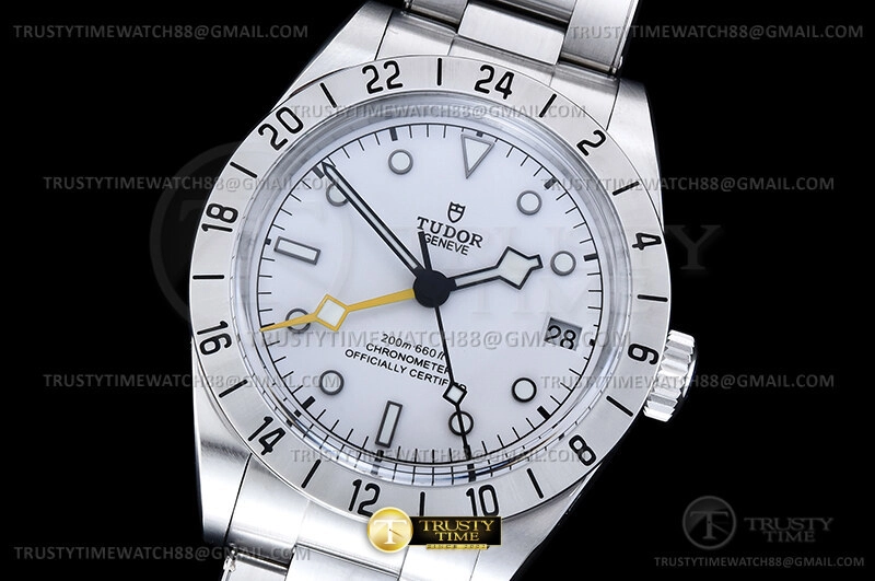 Часы Tudor из коллекции Black Bay GMT. Классические мужские часы Tudor Heritage Black Bay Pro GMT 39mm M79470-0004 премиального качества (Артикул магазина: TD-0861) оснащены надежным автоматическим механизмом с автоподзаводом (работает от амплитуды движения руки) калибра 3186, в котором реализованы следующие функции: часовая, минутная и секундная стрелки, а так же дата, двойное время (GMT). Круглый корпус часов стального цвета, имеющий размер 39 мм и высоту 15 мм превосходно дополнит образ и украсит запястье своего обладателя. Для изготовления часов Tudor Heritage Black Bay Pro GMT 39mm M79470-0004 предлагаемых в нашем интернет-магазине, применяются нержавеющая сталь 316L высокого качества (Швейцарский стандарт), а так же сапфировое стекло высокой прочности, благодаря чему обеспечивается максимальная защита от сколов и механических повреждений. Отличительной чертой данной модели является белый циферблат, часовые индексы которого обеспечивают часовые метки. Завершает образ браслет из нержавеющей стали стального цвета с фирменной раскладывающейся застежкой Tudor. Водонепроницаемость данной модели составляет 30М (WR30) – допускается минимальное воздействие с водой.