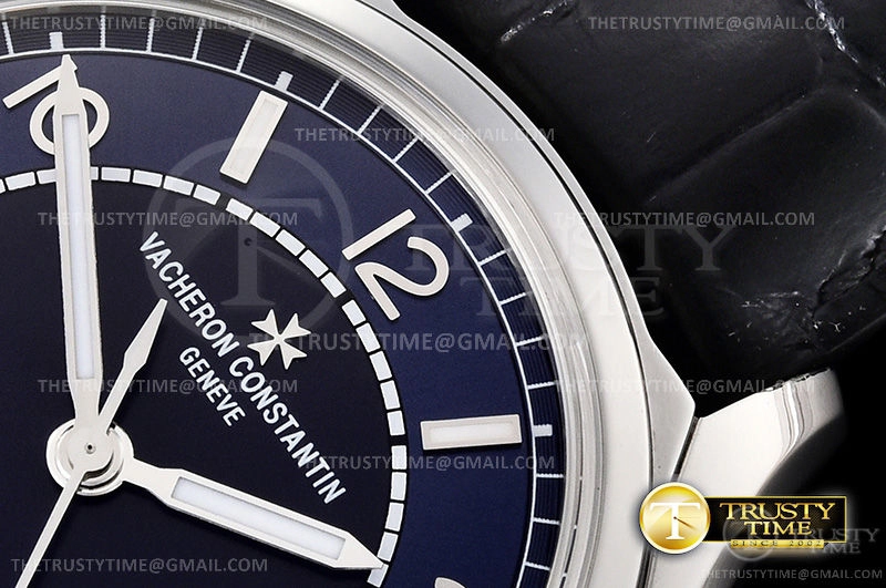 Часы Vacheron Constantin из коллекции Fiftysix Date. Классические мужские часы Vacheron Constantin Fiftysix Date 40mm 4600E/000A-B487 премиального качества (Артикул магазина: VC-0125) оснащены надежным автоматическим механизмом с автоподзаводом (работает от амплитуды движения руки) калибра MY9015, в котором реализованы следующие функции: часовая, минутная и секундная стрелки, а так же дата. Круглый корпус часов стального цвета, имеющий размер 40 мм и высоту 9.6 мм превосходно дополнит образ и украсит запястье своего обладателя. Для изготовления часов Vacheron Constantin Fiftysix Date 40mm 4600E/000A-B487 предлагаемых в нашем интернет-магазине, применяются нержавеющая сталь 316L высокого качества (Швейцарский стандарт), а так же сапфировое стекло высокой прочности, благодаря чему обеспечивается максимальная защита от сколов и механических повреждений. Отличительной чертой данной модели является синий циферблат, часовые индексы которого обеспечивают арабские цифры. Завершает образ кожаный ремешок синего цвета с фирменной раскладывающейся застежкой Vacheron Constantin. Водонепроницаемость данной модели составляет 30М (WR30) – допускается минимальное воздействие с водой.