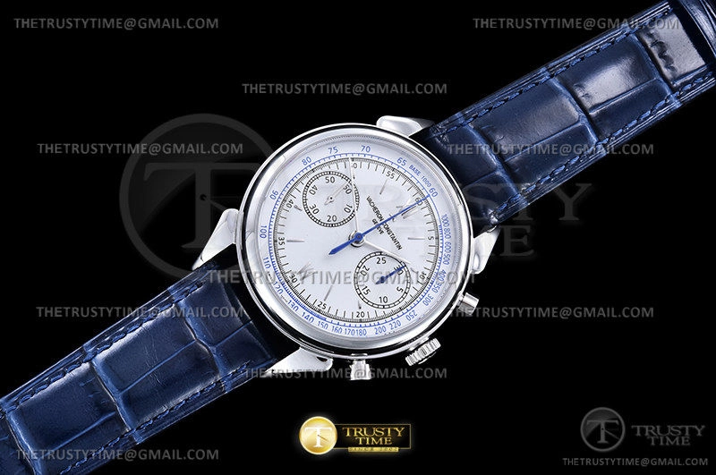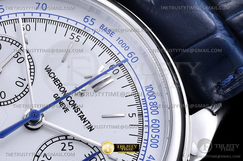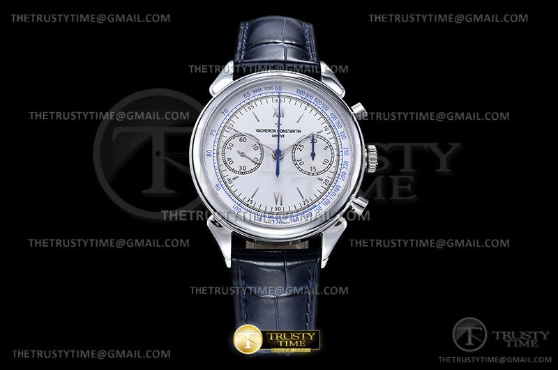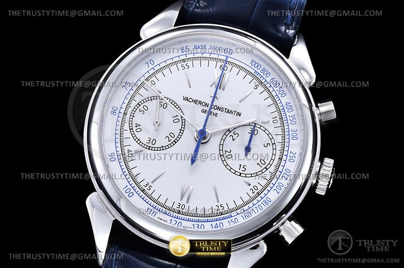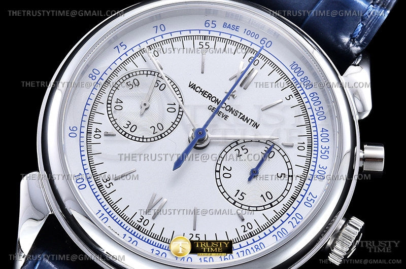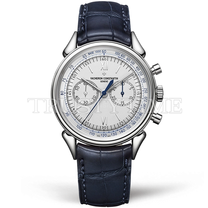 Часы Vacheron Constantin из коллекции Historiques. Спортивные мужские часы Vacheron Constantin Historiques Cornes De Vache 1955 38mm 5000H/000P-B058 премиального качества (Артикул магазина: VC-0259) оснащены надежным автоматическим механизмом с автоподзаводом (работает от амплитуды движения руки) калибра Valjoux-7750, в котором реализованы следующие функции: часовая, минутная и секундная стрелки, а так же хронограф. Круглый корпус часов стального цвета, имеющий размер 38.5 мм и высоту 15 мм превосходно дополнит образ и украсит запястье своего обладателя. Для изготовления часов Vacheron Constantin Historiques Cornes De Vache 1955 38mm 5000H/000P-B058 предлагаемых в нашем интернет-магазине, применяются нержавеющая сталь 316L высокого качества (Швейцарский стандарт), а так же сапфировое стекло высокой прочности, благодаря чему обеспечивается максимальная защита от сколов и механических повреждений. Отличительной чертой данной модели является серебристый циферблат, часовые индексы которого обеспечивают часовые метки. Завершает образ кожаный ремешок синего цвета с фирменной раскладывающейся застежкой Vacheron Constantin. Водонепроницаемость данной модели составляет 30М (WR30) – допускается минимальное воздействие с водой.