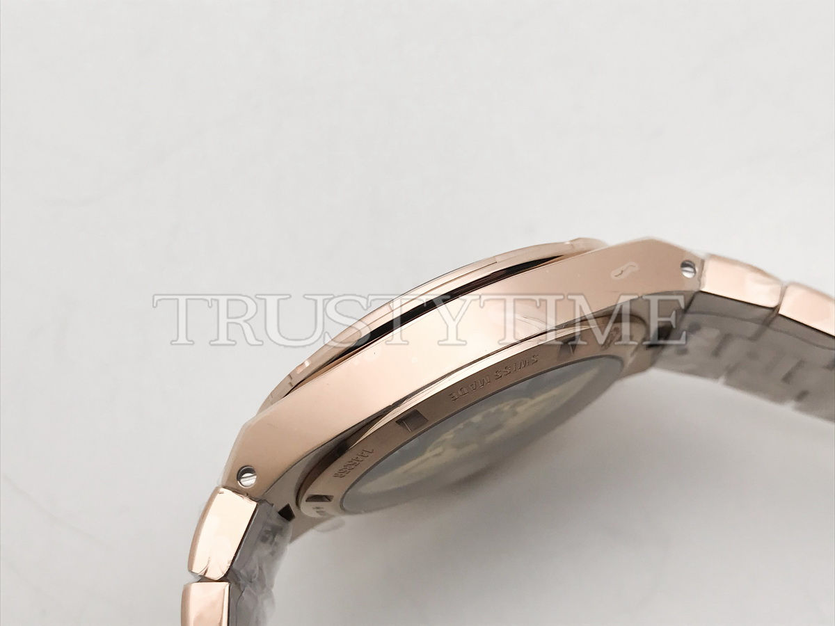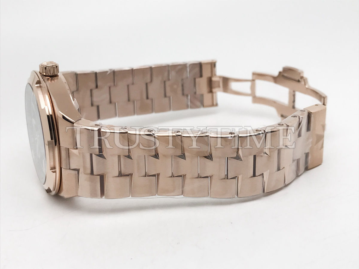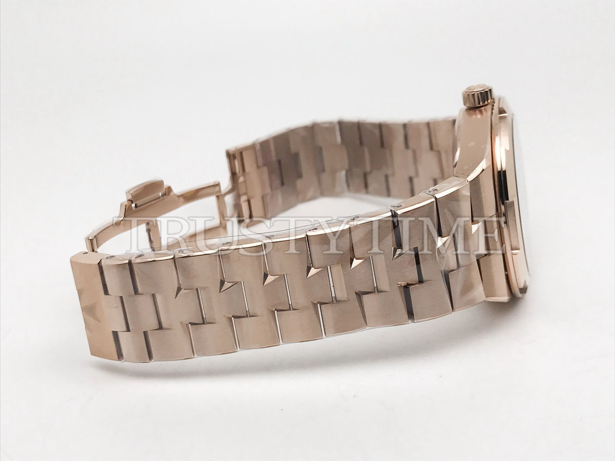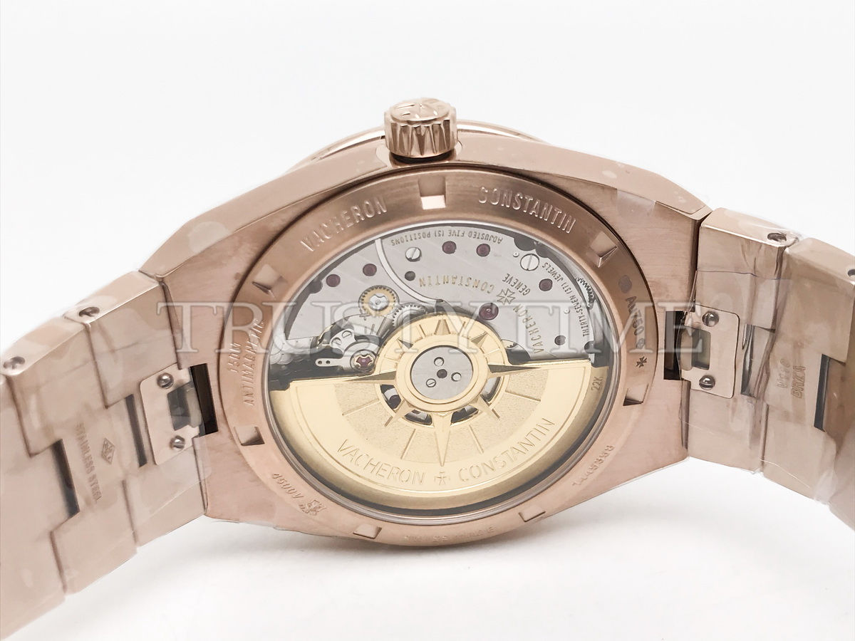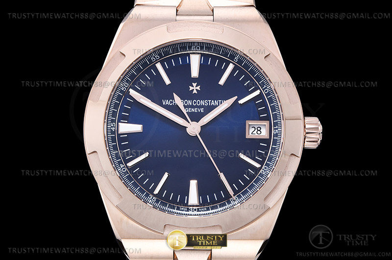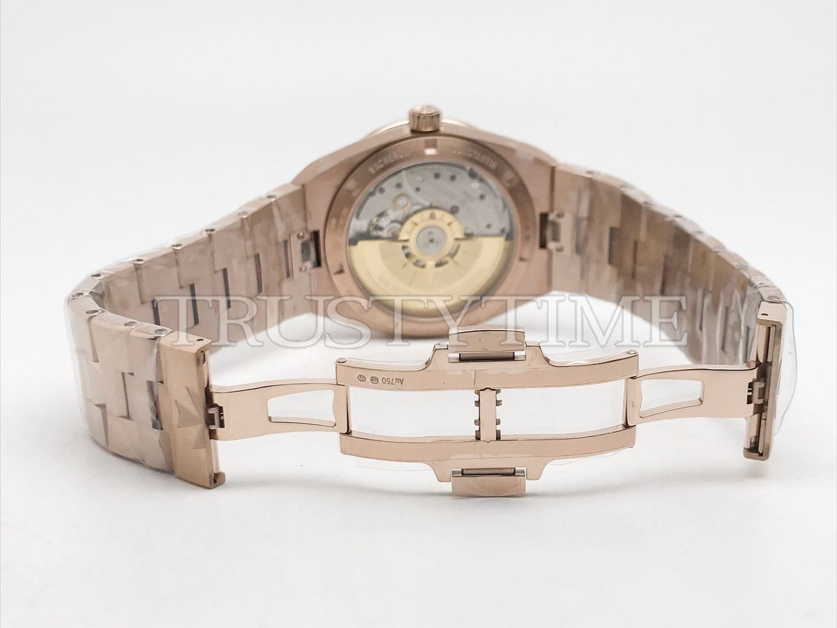 Часы Vacheron Constantin из коллекции Overseas. Классические мужские часы Vacheron Constantin Overseas 41mm 4500V/110R-B705 премиального качества (Артикул магазина: VC-0298) оснащены надежным автоматическим механизмом с автоподзаводом (работает от амплитуды движения руки) калибра 5100, в котором реализованы следующие функции: часовая, минутная и секундная стрелки, а так же дата. Круглый корпус часов розового цвета, имеющий размер 41 мм и высоту 12.5 мм превосходно дополнит образ и украсит запястье своего обладателя. Для изготовления часов Vacheron Constantin Overseas 41mm 4500V/110R-B705 предлагаемых в нашем интернет-магазине, применяются нержавеющая сталь 316L высокого качества (Швейцарский стандарт), а так же сапфировое стекло высокой прочности, благодаря чему обеспечивается максимальная защита от сколов и механических повреждений. Отличительной чертой данной модели является синий циферблат, часовые индексы которого обеспечивают часовые метки. Завершает образ браслет из нержавеющей стали цвета розового золота с фирменной раскладывающейся застежкой Vacheron Constantin. Водонепроницаемость данной модели составляет 30М (WR30) – допускается минимальное воздействие с водой.